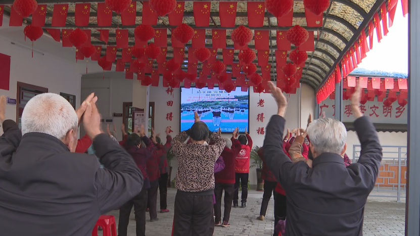 上午九点多钟,广福镇广育村居家养老服务站已经热闹开了,在院子门坪,二十多个老太太和老伯跟着墙上的大屏幕跳起了健身操。
